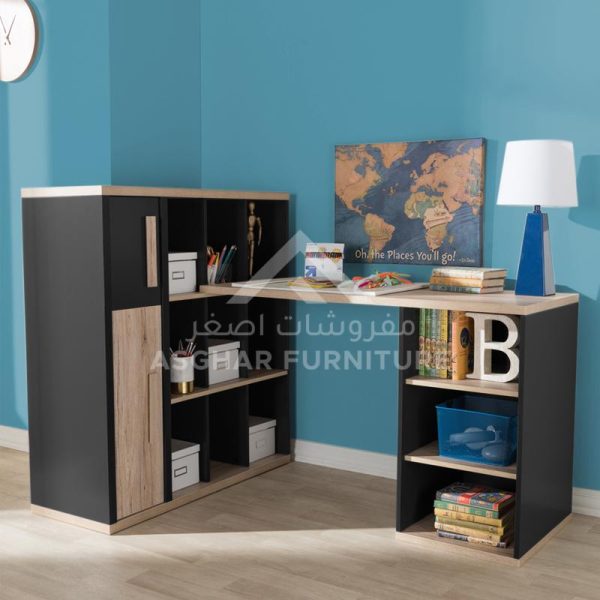 Contemporary Study Desk: This new style study/computer table by Asghar Furniture can be a perfect addition to any living space. The built-in bookshelf includes nine open shelves and two compartments with doors for additional storage space.
