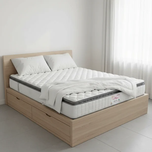 The Sanctu Pillow Top Mattress delivers supportive comfort with a durable Bonnell spring unit, reinforced foam encasement, and multiple layers of medium and high-density foams. A soft knitted fabric with deep quilted top provides a smooth, breathable surface, while felt layers add structure and resilience. The anti-skid base keeps the mattress stable, ensuring lasting performance. At 27 cm height, it’s ideal for balanced support and restful sleep. Backed by a 5-year warranty for peace of mind.